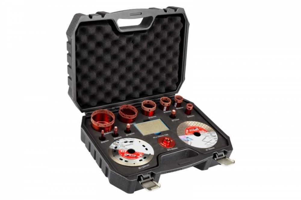speciálně sestavená sada diamantových nástrojů - vrtací, vykružovací, brusné korunky, řezné a brusné kotouče, brusná houba pro profesionální obkladačské práce diamantové korunky a kotouče pod značkou FESTA INDUSTRY rozšiřují řadu produktů určených zejména pro profesionální použití průměry korunek v sadě - 6, 8, 10, 12, 20, 28, 35, 40, 55, 68 mm, brusná korunka 2 - 50 mm - odpovídají nejpoužívanějším průměrům pro např. uchycení sprchových koutů, vykružování otvorů pro průchodky na vodu, odpadní trubky, nebo elektroinstalační krabice pro "suché i mokré" přesné a rychlé vrtání/ vykružování do kamene, tvrdých dlažeb, gresu, obkladů, žuly, mramoru a jiných extrémně tvrdých materiálů nejen ve stavebnictví výška vrstvy diamantu 10 mm, menší velikost diamantových zrn a tím pádem větší hustota diamantových zrn, chladicí vosk nebo u větších průměrů otvory pro chlazení - rychlejší vykružování a výrazně delší životnost - záleží na druhu materiálu a technice! uchycení - závitem M14 pro úhlové brusky nebo s adapterem(22087) i do vrtačky/akuvrtačky diamantový žezný kotouč 125 mm extra tenký - jen 1,2 mm, pro čisté řezy 21235 diamantový řezný a brusný kotouč 125 mm se speciálním hexagonálním tvarem segmentů, výška řezné/brusné vrstvy 25 mm, idealní na kamenické rohy 21231 brusná houba s diamantovou vrstvou hrubost P 60 odolný a praktický plastový kufr s kovovým pantem a zámky,gumová výstelka pro přehledné a bezpečné uložení a převoz Instruktážní video