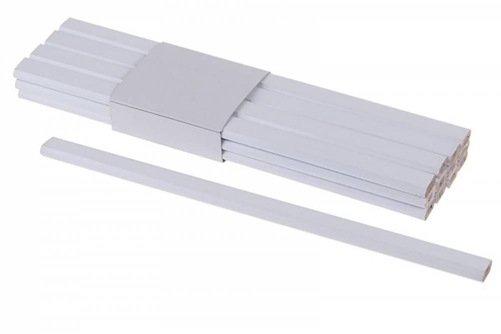 Tesárska ceruzka bez potlače s klasickou čiernou tuhou HB - stredná tvrdosť, nehrotená, použitie - drevo, stavba, biely lak, ploché telo, vhodné na reklamnú potlač.