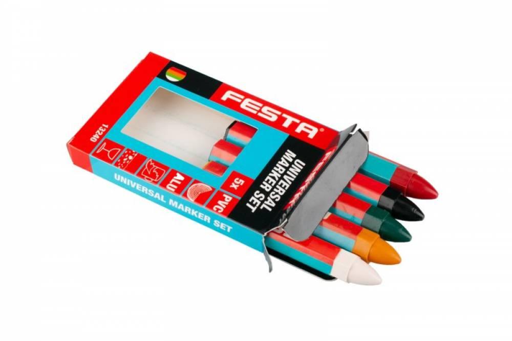 Sada pastelových popisovačov, dĺžka 120 mm, v balení 5 farieb (červená, čierna, žltá, zelená, biela). Vhodné pre: murivo, kovy, drevo, sklo, plast, keramika.