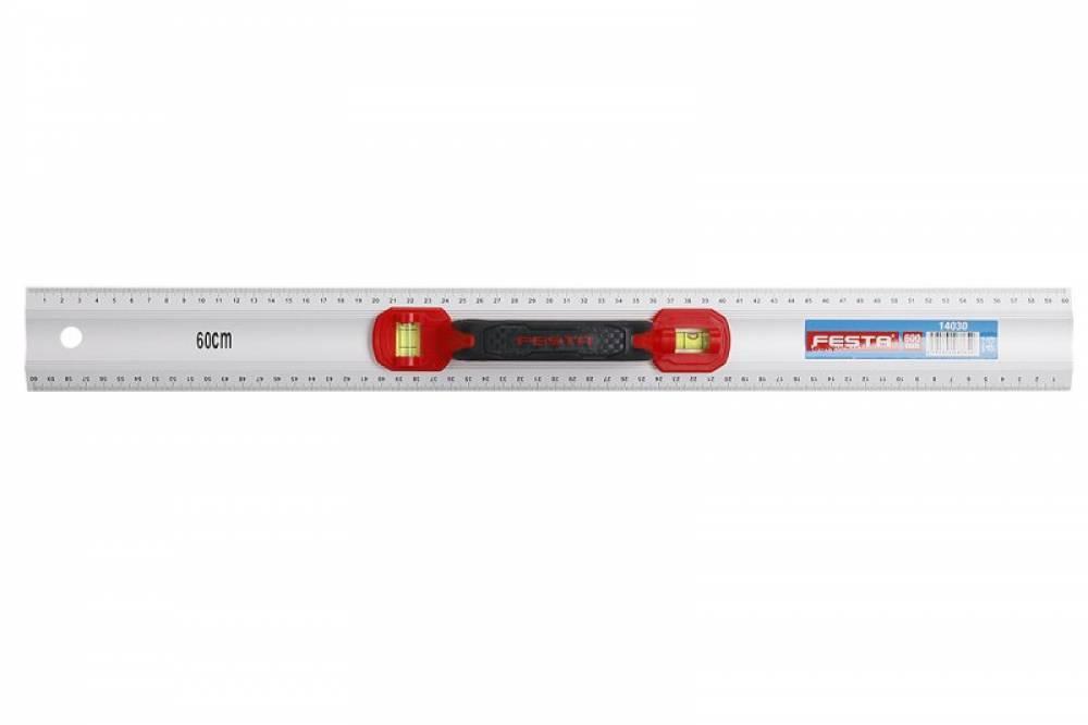 Hliníkové pravítko s rukoväťou, dĺžka 60 cm, horizontálna a vertikálna libela, obojstranná milimetrová stupnica.