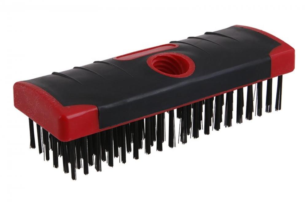 Oceľová kefa so závitom, možnosť naskrutkovať násadu, oceľový drôt - pozinkovaný, plastové telo s pogumovaním.