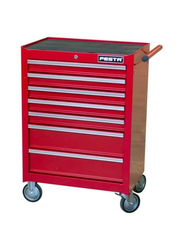 Vozík na náradie FESTA z oceľovej konštrukcie a plechu, 7 zásuviek + samostatná odkladacia priehradka hore sa zdvihnutým okrajom, posuvné zásuvky s guličkovým ložiskom, zásuvky s protišmykovými rohožami, uzamykateľné pomocou centrálneho zámku, praktická rukoväť pre jednoduché ovládanie. Vozík na náradie je vybavený kovovými kolesami s gumovou obručou, 2 otočné kolesá sú opatrené brzdou. 680 x 460 x 1020 mm.