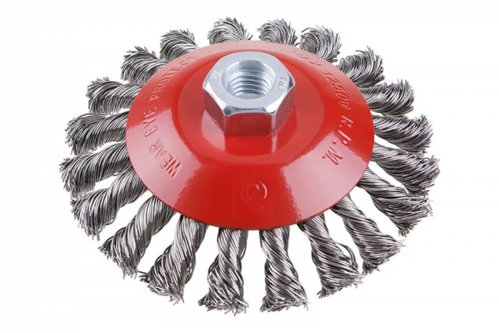 Rotačná kefa - misková, prevedenie: COPY - patentovaný drôt 0,5 mm - copy, sa ani pri extrémnom zaťažení nerozpletajú, priemer Ø 115mm, závit M14x2 mm, počet drôtov: 900, dĺžka drôtu: 23 mm, max. prípustné otáčky: 12500 1 / min, použitie: odstránenie farby, hrdze, otrepov, zvyškov po zvarovní, trosky, zdrsňovanie, čistenie kovoých súčasťou