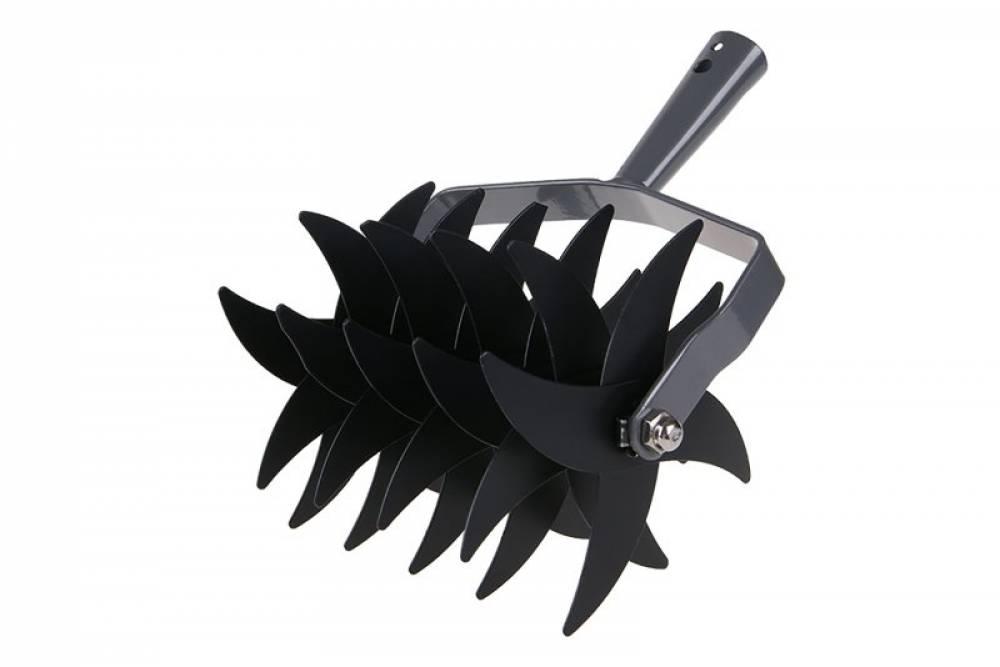 Päť radový, ručný, hviezdicový kultivátor trávnika, šírka 17 cm, s tulejou na násadu.