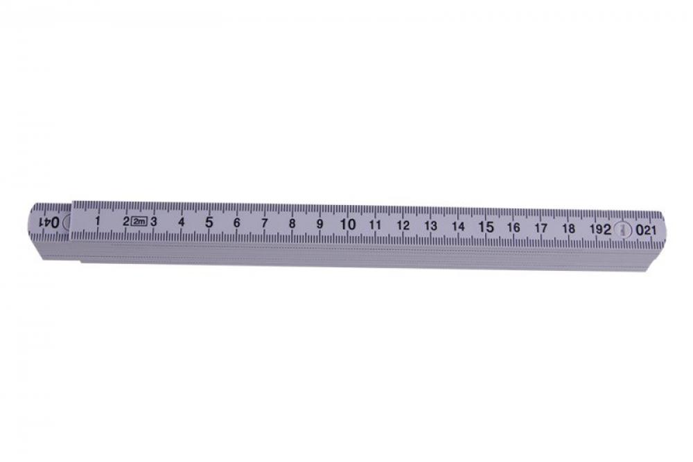 Plastový skladací meter, biela farba, obojstranná stupnica v mm - dobre čitateľná čierna potlač, zámky s možnosťou aretácie dielika v 90° polohe.