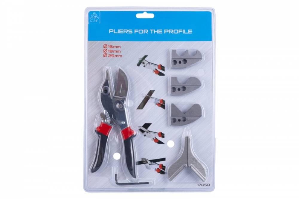 Kliešte na PVC lišty a rúrky, kliešte s kaleným ostrím a výmennými čeľusťami, pre strihy PVC líšt s nastaviteľnými uhlami a PVC rúrky, ergonomické rukoväte, blister.