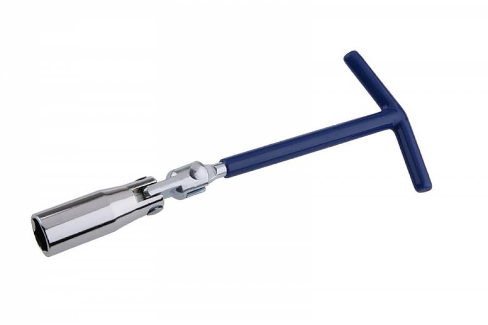 T kĺbový kľúč na sviečky 16 mm, určený na montáž alebo demontáž zapaľovacích sviečok automobilu. Kĺbová redukcia slúži pre ľahšiu manipuláciu pod rôznymi uhlami.