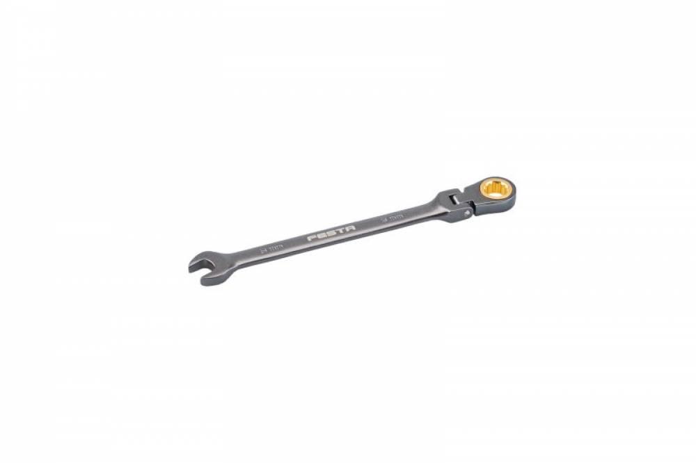 Račňové kľúče FESTA s kĺbom pre použitie pod uhlom s výhodou rohatky (račne) sú vyrobené kovaním z kvalitnej chromvanadiovej ocele. Táto oceľ povrchovo upravená matným tvrdochrómom pre dosiahnutie optimálnej povrchovej tvrdosti a odolnosti voči korozívnym vplyvom. Rohatku ráčny klíče tvoří 72 kalených zubů, záber po 5-tich oblúkových stupňoch. kvalitou, tvrdosťou a presnosťou presne zodpovedajú norme DIN / ISO.