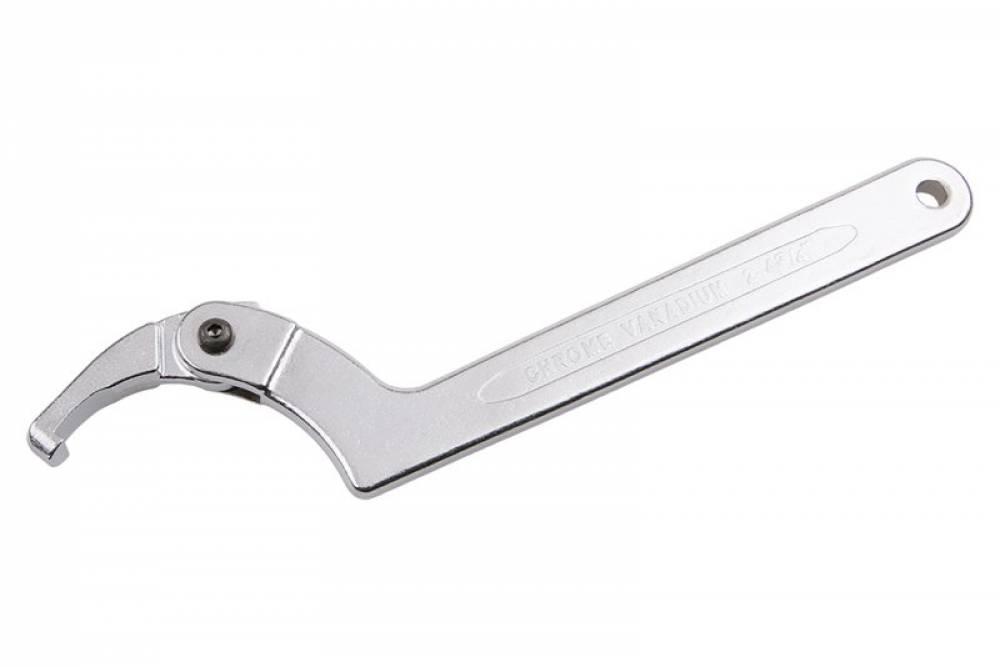Nastaviteľný hákový kľúč pre goliere, krúžky a ložiská. Jediná čeľusť s upínacím kolíkom v priemyselnej povrchovej úprave. Pri používaní zaistite presné nasadenie háku čeľuste. prevedenie: matný chrómovaný povrch, kovaný, chróm vanadiová oceľ.