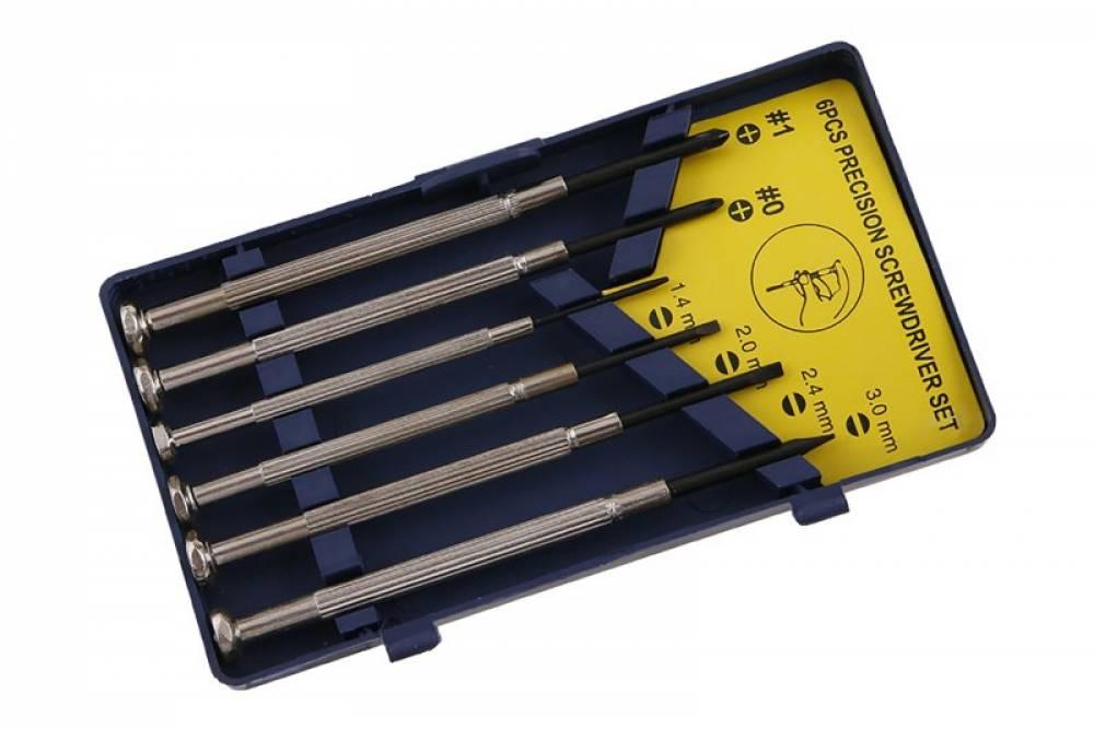 Sada najpoužívanejších tvarov hrotu a veľkostí skrutkovačov pre jemnú mechaniku a optiku (plochý 1,4; 2; 2,4; 3 + PH0, PH1). Pre hobby použitie.