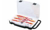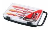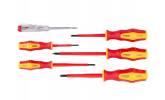 Sada 6 ks elektrošroubovákov FESTA sa skúšačkou v plastovom kufríku. Skrutkovače majú certifikáciu elektro VDE 1000 V, IEC / EN 60900-2004, kovový driek je vyrobený z veľmi kvalitnej chromvanadiovej ocele, kalený hrot je magnetický, kombinácia polypropylénu a gumy na ergonomicky tvarovanej rukoväti zaručuje výborné antišmykové vlastnosti a dobrú odolnosť voči mazadlám a chemikáliám