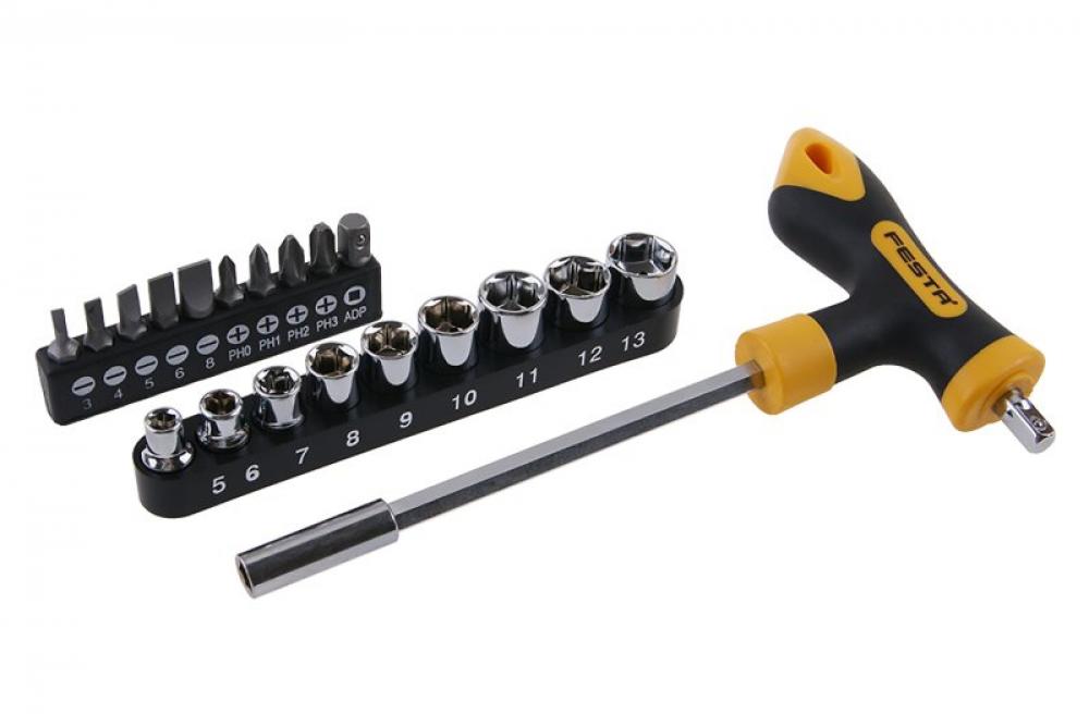 Skrutkovač T + 20 nástavcov, 1/4". CrV, magnetická koncovka. Sada obsahuje: bity: ploché (1;1,5;2;2,5;3;3,5) a PH (0;1;2;3), hlavice 9ks.