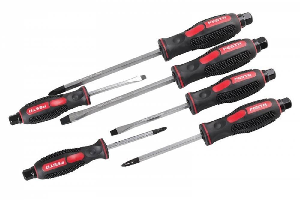 Sada úderových skrutkovačov CrV 6ks. Sada obsahuje: 3x plochý skrutkovač (5, 6, 8 mm), 3x krížový skrutkovač (1, 2, 3 mm). Zakončenie šestihraného drieku prechádzajúceho celou rukoväťou je možné použiť ako úderovú plochu pre kladivo alebo povoľovanie a uťahovanie pomocou kľúča alebo račne s nástrčným kľúčom. Presne frézovaný magnetický hrot.