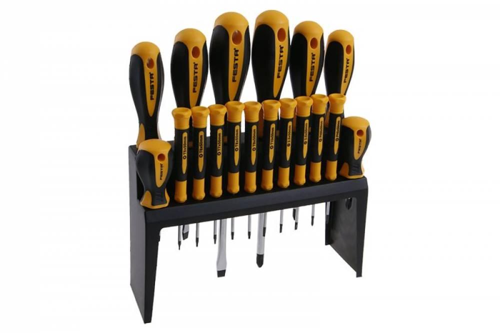 Sada kvalitných skrutkovačov vrátane plastového stojanu s ergonomicky tvarovanou rukoväťou vrátane antiskluzového povrchu, CrV, magnetická koncovka, tvrdených v celej dĺžke. Sada obsahuje: plochý (8x150, 6x105, 5x80, 6x40, 1,5x50, 2x50, 2,5x50 mm), krížový (3x150, 2x105, 1x80, 2x40, 0x50, 00x50, 000x50 mm) a TORX (5x50, 6x50, 7x50 mm).