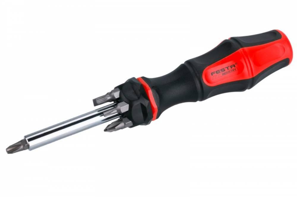 Skrutkovač + 6 nástavcov, 1/4". CrV, magnetická koncovka. Sada obsahuje ploché aj PH nástavce. Ergonomická dvojkomponentný tvarovaná rukoväť. ploché: 5,6,7 + PH1,PH2,PH3.