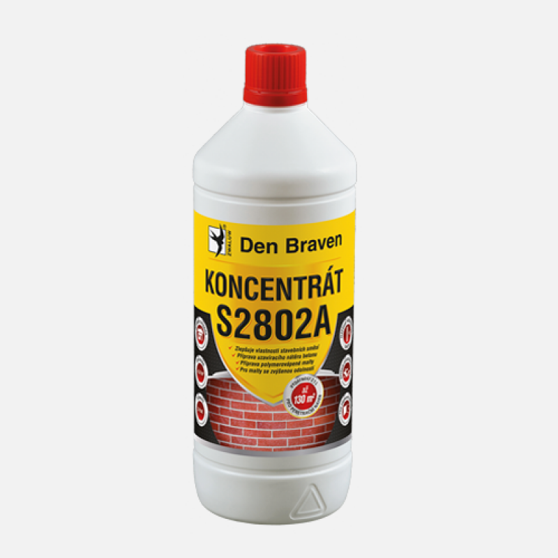 Koncentrát stavebných zmesí S2802A je kvapalina na báze vodnej disperzie styrénakrylátového kopolyméru miešateľná s vodou v každom pomere. Odparením vody z tenkej vrstvy sa vytvorí súvislý hladký, zliaty, slabo lepivý film nerozpustný vo vode, ktorý v organických rozpúšťadlách buble. Vlastnosti Miešateľný s vodou v každom pomere; Po vytvrdnutí vo vode nerozpustný; Skvalitňuje vlastnosti všetkých stavebných zmesí; Zvyšuje priľnavosť následných vrstiev; Zvyšuje pevnosť a bezprašnosť omietok, poterov a ďalších cementom spojených hmôt; Zvyšuje odolnosť proti poveternostným vplyvom vrátané UV žiarenia; Detailné informácie k výrobku, postupy, hodnoty atď. sú uvedené v technickom liste.
