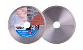 Diamantový kotúč DIAMANT, prevedenie: "PLNÝ" - celoobvodový, kvalitná diamantová vrstva s vysokým obsahom diamantového prachu, presné spracovanie - napojenie na nosný disk kotúča odolávajúci vysokým teplotám, použitie: určený pre mokré i suché rezanie dlažby a obkladov, betónu, tehál, muriva, žuly, mramoru, kameňa, skla, keramiky, balenie: blister s eurootvorom, priložený redukčný krúžok z Ø 22,2 na 20 mm, rozmery: uvedený v názve výrobku.