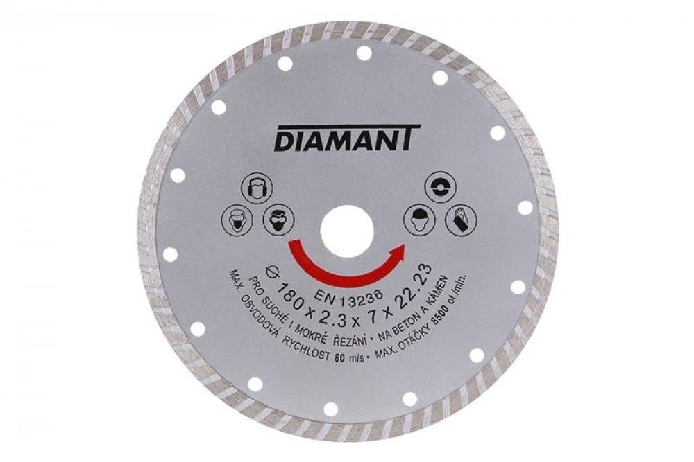 Diamantový kotúč DIAMANT, prevedenie: TURBO, kvalitné materiály i spracovanie, špeciálny tvar diamantových segmentov aj konštrukcia a pevné uchytenie k nosnému disku kotúča, vysoký obsah diamantového...