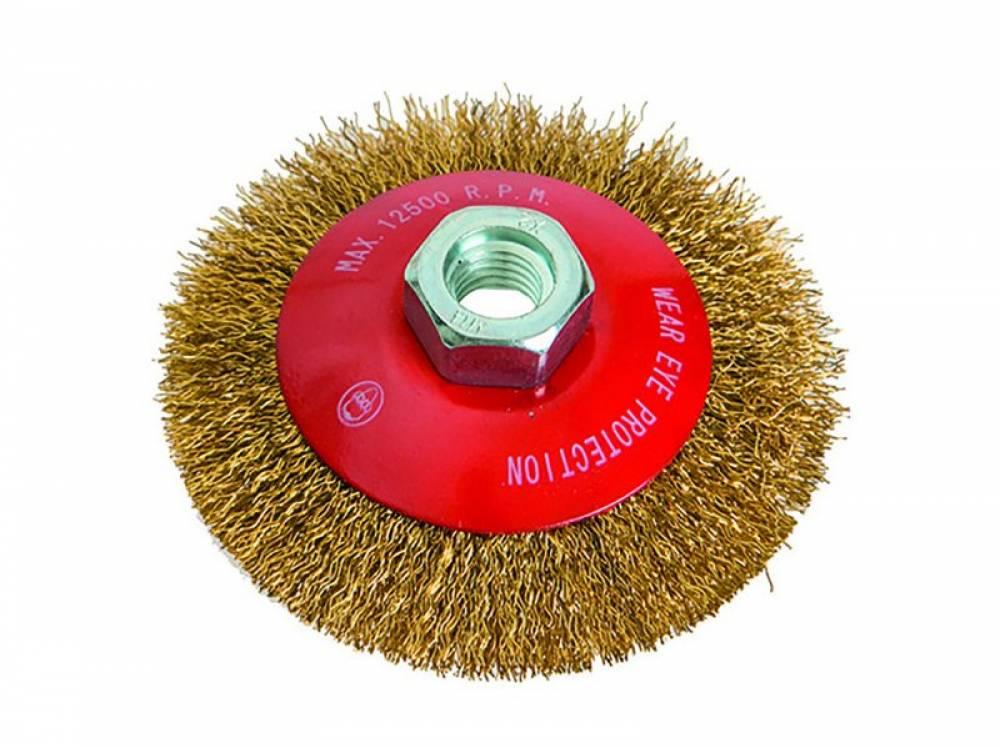 Rotačná kefa misková s medenými vlnitými drôtmi. Uchytenie M 14. Vhodné na nerezový materiál.