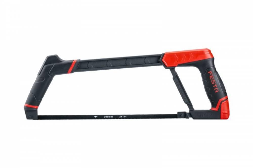 Hliníkový rám; Mäkčená gumová PTR rukoväť'; 300mm oceľový plátok s kalenými zubami; Plastová skrutka pre rýchlu výmenu plátku.