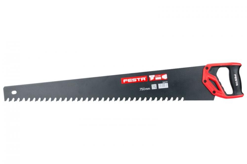 Ergonomická ABS rukoväť s mäkčenou TPR gumou; Tuhý oceľový list s reznými doštičky zo spekaných karbidov zaručujúce dlhodobý rezný výkon; Počet osadených zubov: 34; Pracovná dĺžka: 750mm; použitie: profesionálna píla pre rezanie pórobetónových blokov.