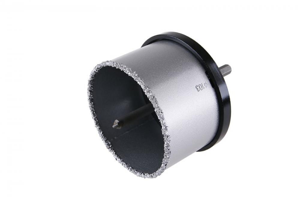 Sada vykružovacie korunky 103 mm s karbidovým ostrím pre čisté a presné vŕtanie keramických obkladov a dlaždíc; Univerzálny unášač pre korunkové vrtáky; Špeciálny vodiaci vrták.