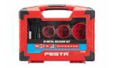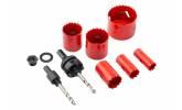 Sada HSS korunkových vrtákov BI-METAL 9ks, priemery: 19,22,29,38,44,57 mm, použitie:drevo, drevotrieska,sadrokartón, kovy do sily 8mm.