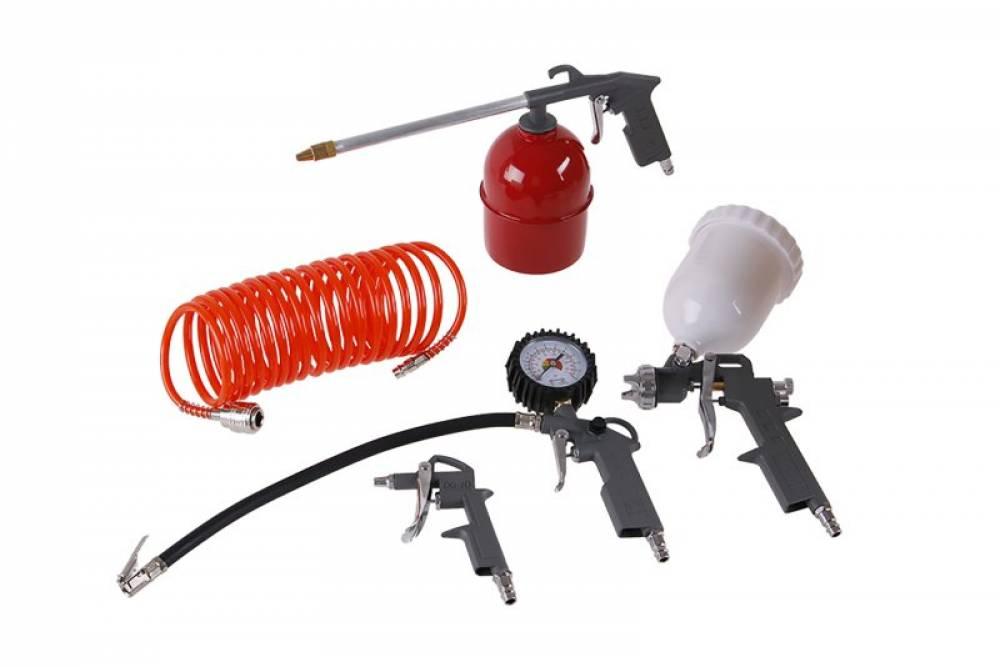 Kompresorová sada sa skladá z pištole nafukovacej s manometrom - pre ľahké plnenie stlačeným vzduchom (napr. pneumatík automobilov, kolies a pod.), pištoľ striekacia s dolným a horným plnením - pre nanášanie náterových hmôt (lakov, syntetických a vodou riediteľných farieb) na povrchy, pištoľ ofukovacia - pre vyfukovanie napr. kovového prachu zo zle prístupných miest, špirálová hadica 5m - pre pripojenie pneumatického náradia ku kompresoru. Pracovný tlak 5bar - max. 8bar.