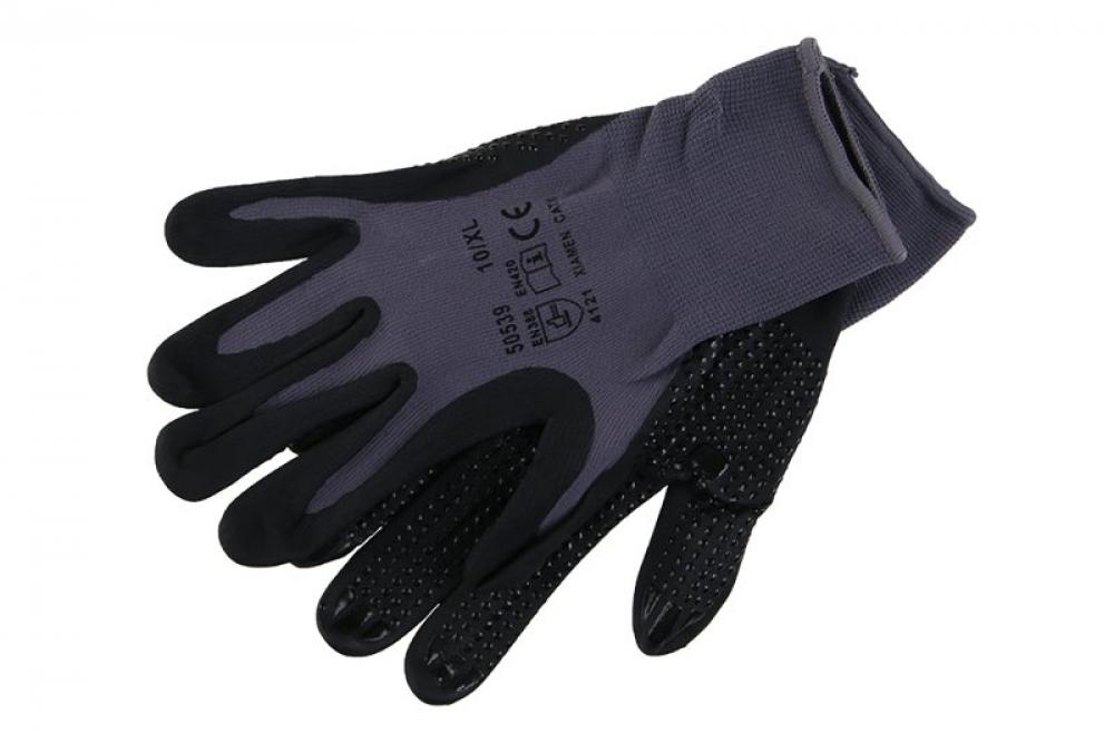 Šedý úplet z jemného nylonu, dlaň olejovaná v kvalitnej nitrilovej pene s terčíkmi na dlani, CE EN 388, veľkosť 10.