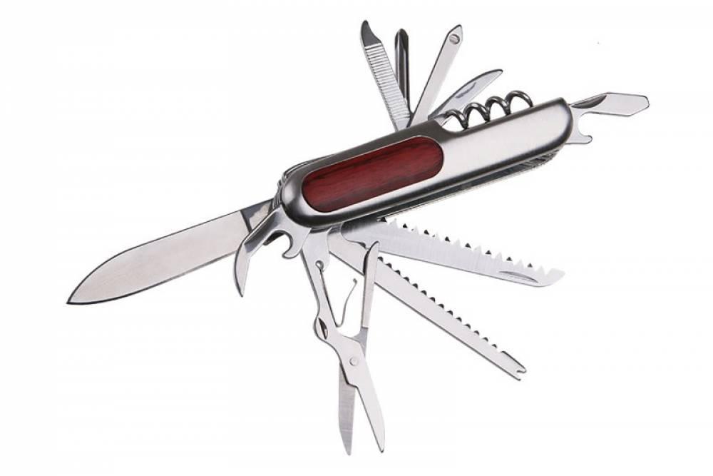 Nôž vreckový multifunkčný INOX. Dĺžka zavretého noža 95 mm. Nerezový multifunkčný nôž s 11 rôznymi časťami pre rôzne spôsoby použitia. Rukoväť v kombinácii kov - drevo. Hmotnosť 0,666 kg.