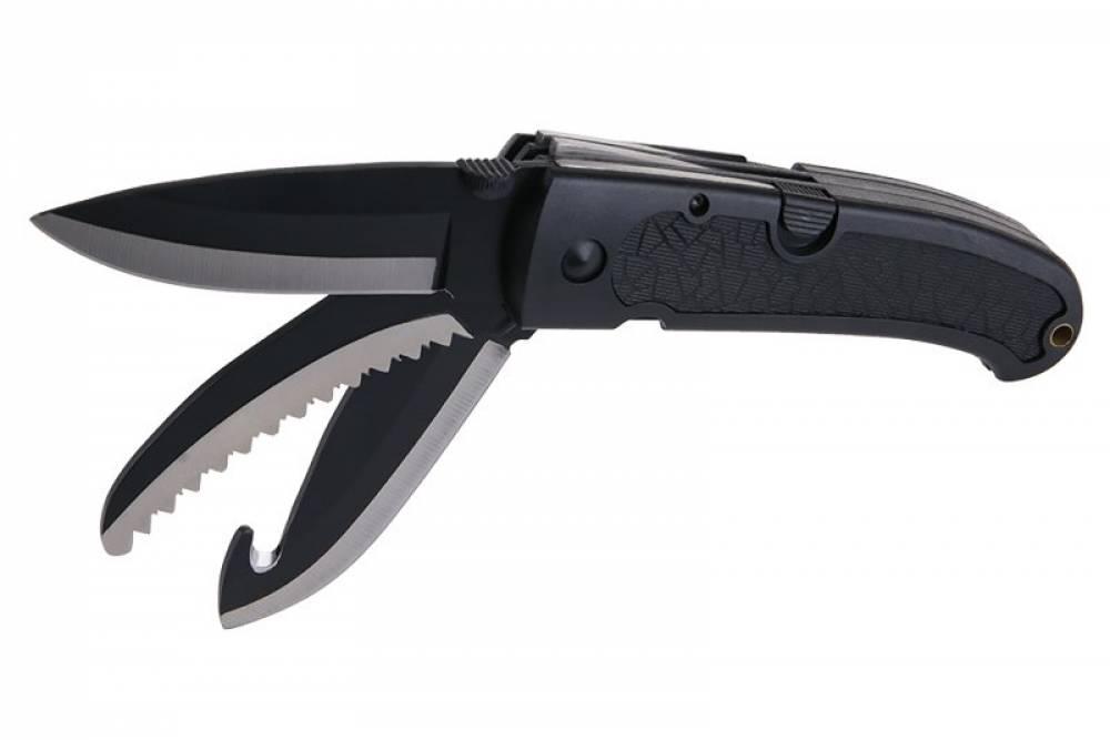 Nôž vreckový multifunkčný SHARK. Dĺžka zavretého noža je 130 mm. Multifunkčný nôž s 3 rôznymi časťami pre rôzne spôsoby použitia. Rukoväť v kombinácii plast - guma. Hmotnosť 0,164kg.