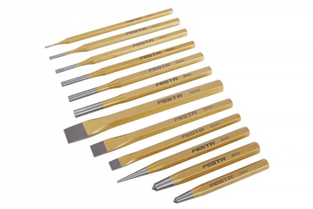 Sada sekáčov, jamkovačov a priebojníkov FESTA vyrobená z chróm vanádiovej ocele. Sada obsahuje 12 ks jamkovač: 2, 6, 8 mm, sekáč: 16, 12, 10 mm, priebojník: 1-5-3-4, 4-6-8 mm.