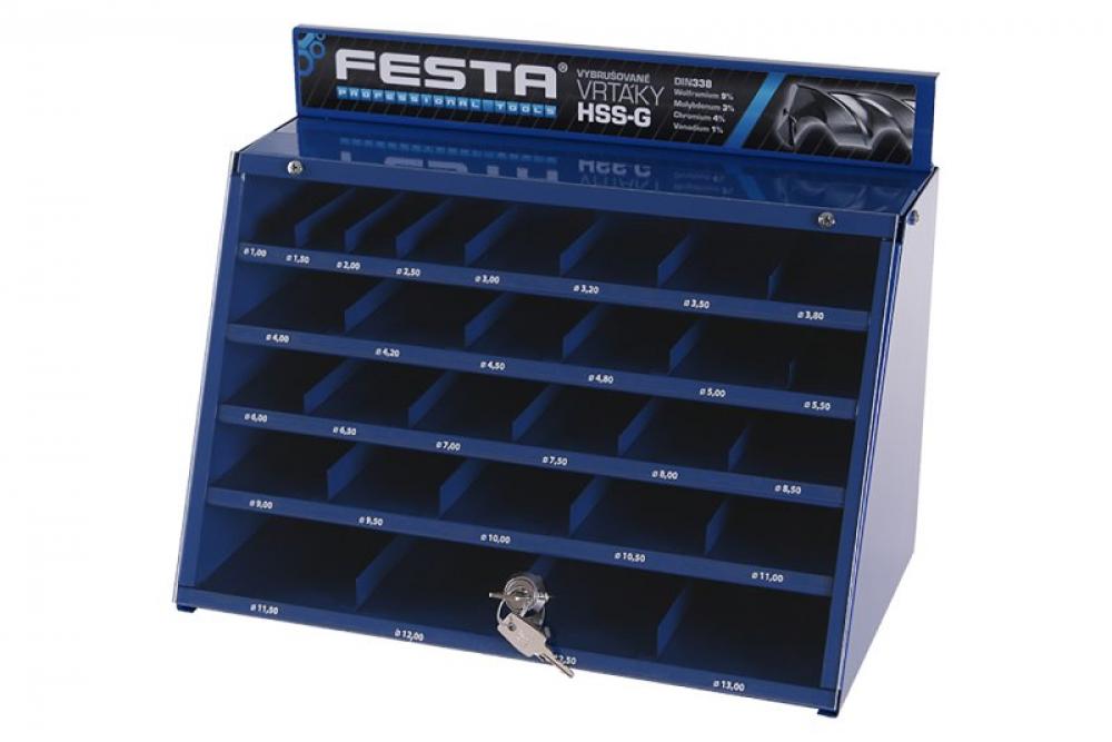 Plechový box pre prehľadné usporiadanie vybrusovaných vrtákov HSS-G W9 s priehľadnou čelnou stenou, uzamykateľný na kľúčik. Box je plne osadený najpredávanejšími profi vrtáky.