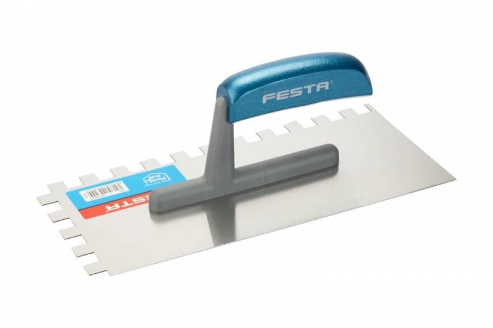 Hladítko nerezové zubové FESTA 280x130 mm, zub e12, s drevenou lakovanou rúčkou, tl.plechu 0,8 mm. Používa sa najmä na nanášanie lepidiel pod obklady a dlažby, ďalej potom na nanášanie stierok, štukov, omietok, tmelov a ďalších stavebných hmôt. Hladítko nerezové zubové umožní natiahnuť lepidlo či stavebnú hmotu v pruhoch a výške podľa zuba hladidla.