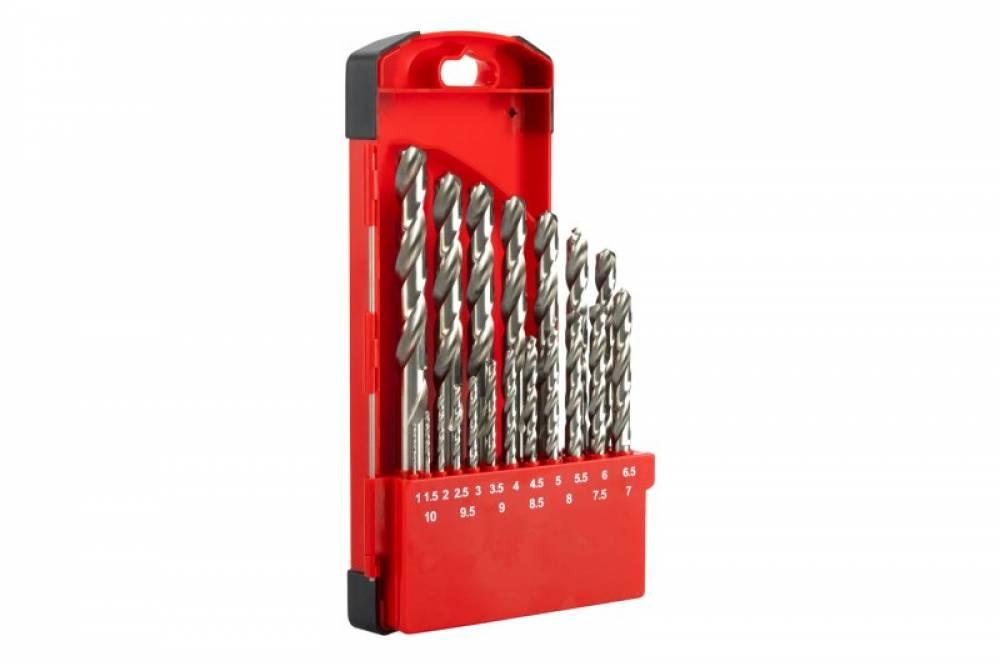 Sada vybrusovaných vrtákov HSS-G, spĺňajúce normu DIN 338, RN, vrtáky sú vyrobené z vysoko kvalitnej rýchloreznej ocele (HSS), oceľ je zušľachtená legúr - Wolfram 9%, Molybdén 3%, Chróm 4%, Vanádium 1% - pre vŕtanie ocelí do 900 N / mm². Presné vybrúsenie skrutkovice pre maximálny výkon, presnosť a dobré centrovanie, vďaka vybrúseniu uhla špičky vrtáka 118° možno vŕtať aj bez nutnosti použitia jamkára, určené na priemyselné použitie.