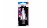 Stupňovitý vrták z kvalitnej HSS ocele DIN 1412C, použitia: pre vŕtanie zliatin a oceľových plátov do hrúbky 4 mm, plastu a dreva, široké drážky ľahko odvedú odvŕtaný materiál, rozmery: 13 stupňov, Ø 5 - 35 mm, priemerov sú označené na vrtáku (alebo obale).