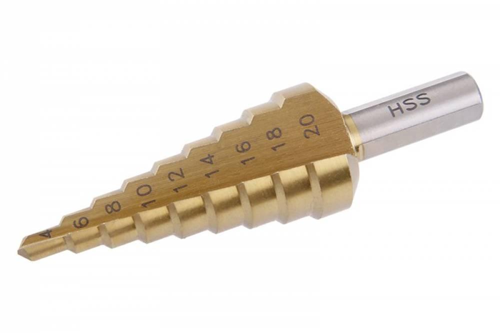 Stupňovitý vrták z kvalitnej HSS ocele DIN 1412C s TiN vrstvou, vrstva TiN zvyšuje odolnosť a životnosť vrtáka,