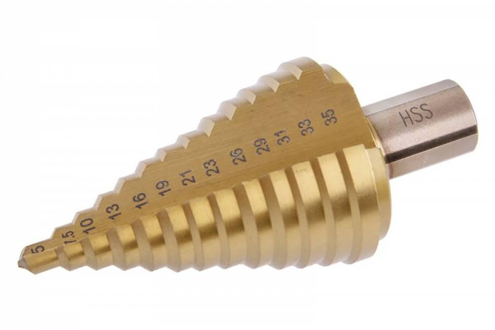 Stupňovitý vrták z kvalitnej HSS ocele DIN 1412C s TiN vrstvou, vrstva TiN zvyšuje odolnosť a životnosť vrtáka,
