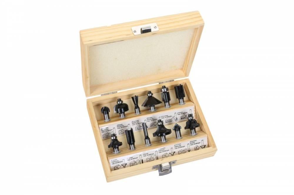 Tvarové frézy na drevo - sada 12 ks, frézy sú osadené kvalitnými SK plátky, rôzne druhy tvarových fréz bez alebo s vodiacim kolieskom a kvalitným ložiskom, použitie: pre frézovanie drážok a hrán rôznych tvarov, stopka Ø 8mm, balenie: Drevený box.