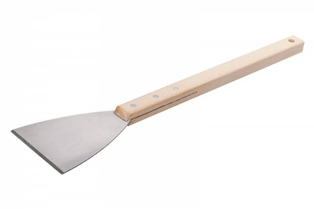 škrabací nerezová špachtle FESTA 100 mm zesílená čepel - tloušťka 2 mm s broušenou hranou kvalitní dřevěná prodloužená rukojeť 350 mm, pro maximální přenos síly obou rukou při práci