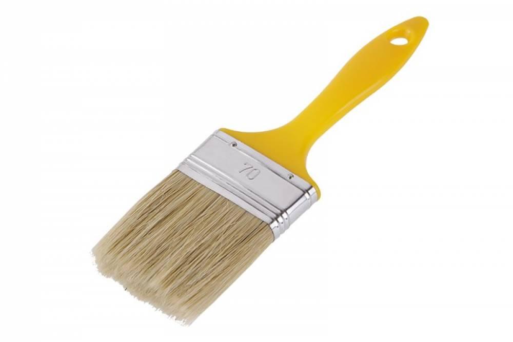 Štetec plochý 70x15x65mm so žltým plastovým držadlom, svetlá štetina - táto štetina sa získava z čínskych ošípaných vo farebnom prevedení svetlá, čierna a sivá. Hmotnosť 0,093 kg.