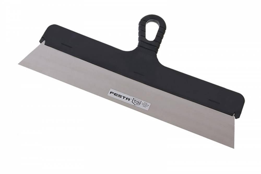 Špachtle fasádní nerezová 400 mm FESTA s plastovou rukojetí. Je užíván ve štukatérství, malířství, natěračství, opravách karosérií nebo při umělecké tvorbě apod. Je vhodná pro roztírání sádry nebo jiných tmelících hmot či k odstraňování staré malby a nátěrů.