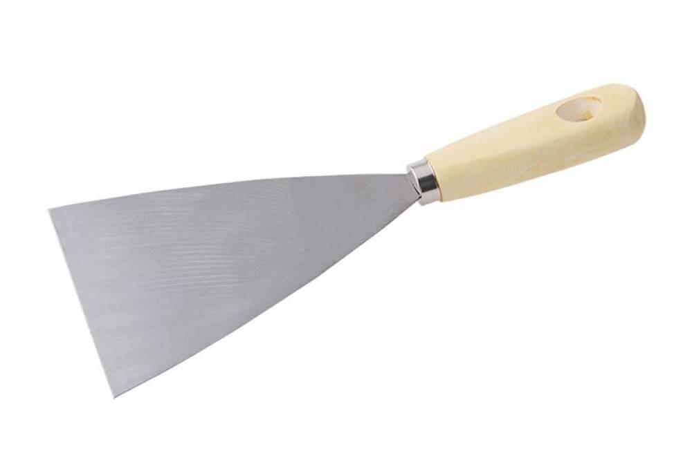 Špachtle ocelová 100 mm s dřevěnou ručkou. Špachtle se používá k nanášení a roztírání stavební sádry, tmelů nebo k očištění a odstranění starých tmelů, maleb či tapet. Díky trojúhelníkovému tvaru se materiál velmi snadno nanáší i odstraňuje.