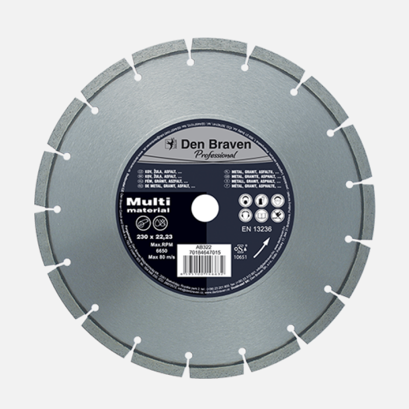 Laserom zvárané segmenty. Použitie: Multifunkčné pre rezanie širokej škály materiálov: kov, inox, kameň, betón, asfalt, žula. Maximálna obvodová rýchlosť: do Ø230 mm = 80 m/s.