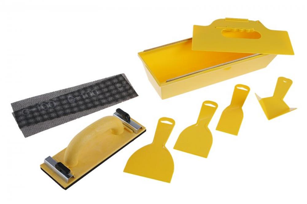 Sada pre sadrokartonárov 9 -dielna, zloženie: vanička, štyri druhy špachtlí, 1 rohová, držiak na brúsnu mriežku, 2ks brúsnej mriežky zrnitosť 100. Sada je určená na tmelenie a brúsenie sadrokartónu.