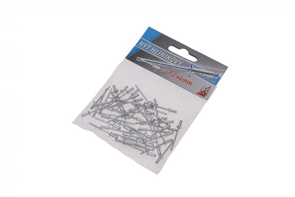 Klasické trhacie slepé alumíniové nity priemer 3,2 mm dĺžka 6 mm v malom balení 50 kusov, vhodné pre malospotrebiteľov. •