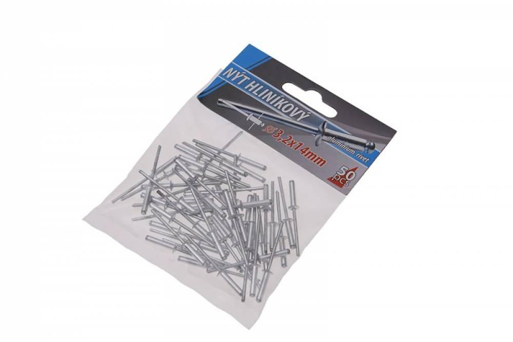 Klasické trhacie slepé alumíniové nity priemer 3,2 mm dĺžka 14 mm v malom balení 50 kusov, vhodné pre malospotrebiteľov.