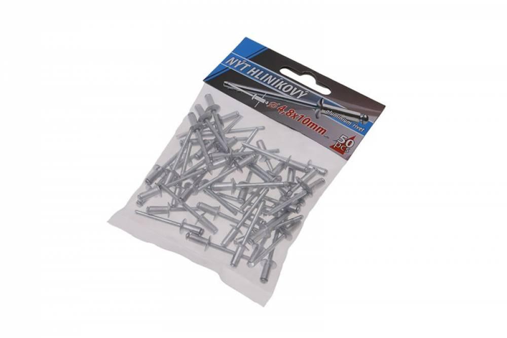 Klasické trhacie slepé alumíniové nity priemer 4,8 mm dĺžka 10 mm v malom balení 50 kusov, vhodné pre malospotrebiteľov. •