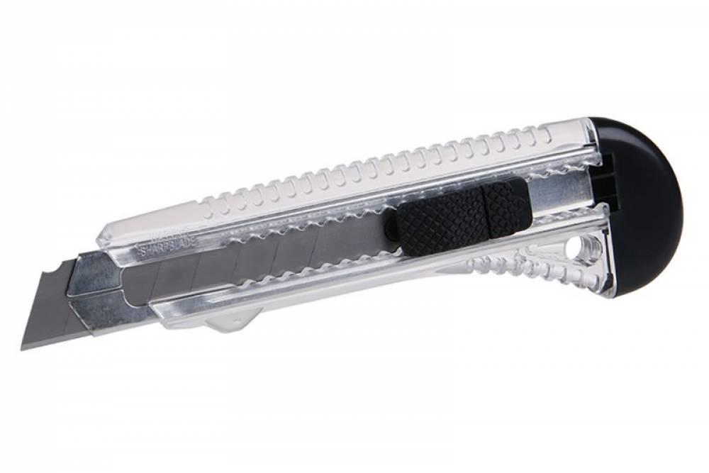 Odlamovací nôž, oceľová vodiaca lišta, tlačidlový posuv s aretáciou, 18mm.