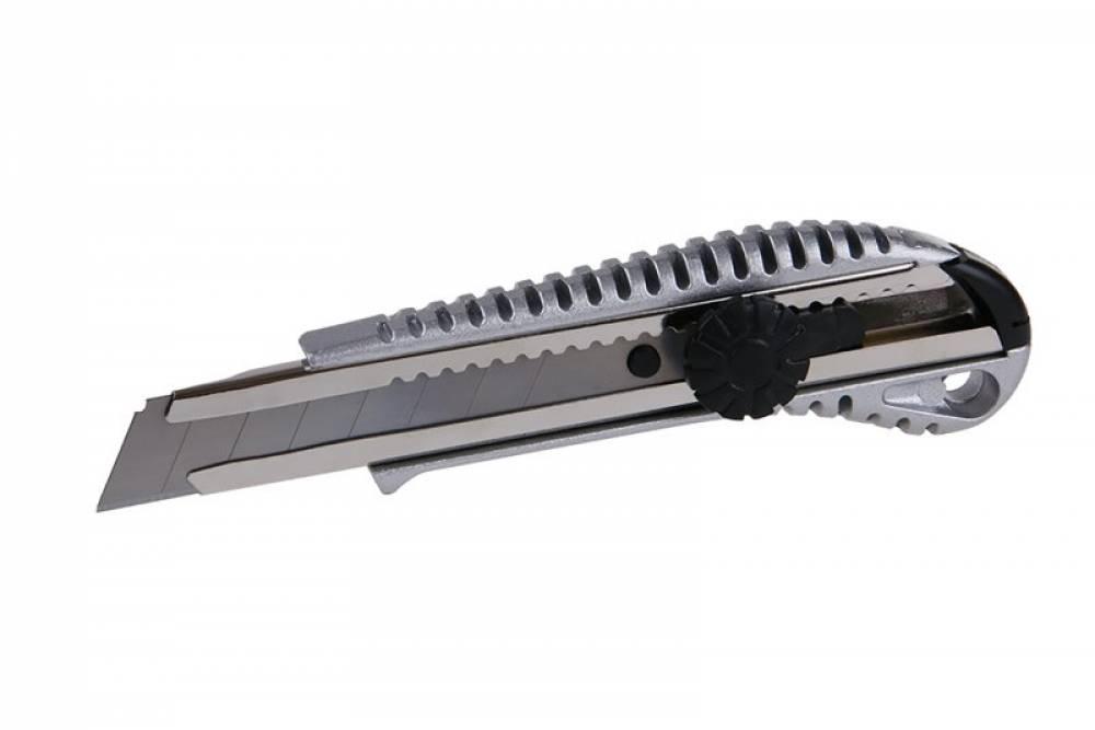 Odlamovací nôž, kovové telo, protišmykové drážky, oceľová vodiaca lišta, skrutková aretácia, 18mm.